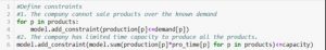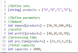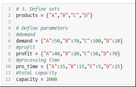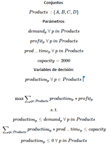 Teniendo nuestras instancias preparadas, para cualquiera de los dos casos, la primera parte de nuestra formulación debe ser la definición de conjuntos y parámetros. En nuestro ejemplo de producción de la empresa XYZ tenemos un conjunto de referencias de productos, tres parámetros asociados a los productos (demanda, ganancia, tiempo de producción), y la capacidad total disponible.