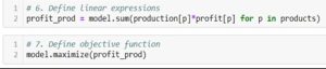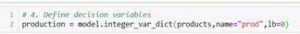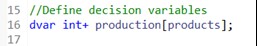 Para nuestro ejemplo la variable producción está indexada en el conjunto de productos. Para OPL, sólo debemos agregar [products] para definir el índice de las variables. En Python, debemos elegir una estructura tipo diccionario para almacenar más de una variable, el primer parámetro dentro del paréntesis debe ser los índices para los que indexará la variable.