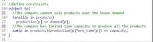 Adicionalmente, la restricción de naturaleza de las variables (las variables de decisión deben ser mayor o igual a 0) puede definirse desde la creación de las variables. En OPL es necesario definirlo como int+ y en Python debe incluirse un parámetro lb(lower bound) con el mínimo valor que debe tomar la variable, en este caso es 0.
