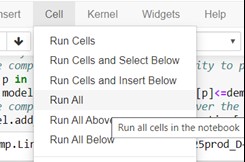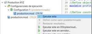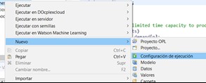 Este paso si es muy diferente para las dos opciones. Para el caso de OPL, se debe crear una instancia de configuración de ejecución donde debe agregarse el modelo que se quiere ejecutar, desde allí se debe ejecutar el archivo .mod. Para el caso de Python, debe darse una instrucción de solución en el código de tal forma que se llame al motor de optimización cuando se ejecute el script.