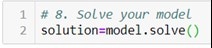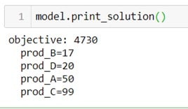 En el caso de Python todos los resultados se almacenan en el elemento model y deben ser consultados por medio de métodos propios de la librería docplex. La forma más rápida de ver los resultados es imprimiéndolos con el comando model.print_solution(), este ofrece un resumen de la función objetiva y los valores de las variables.