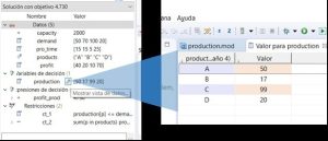 IBM ILOG CPLEX Optimization Studio tiene la ventaja de tener una visualización de datos y resultados del modelo integrada (estos están en el recuadro de la esquina inferior izquierda para quien sea nuevo con CPLEX Studio). Desde allí se pueden consultar los valores de entrada, los valores de las expresiones lineales y las variables de decisión, incluso cuando el número de variables es grande.