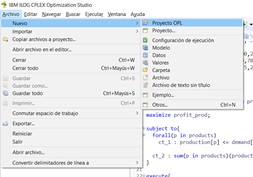 Cada una de nuestras opciones requiere un procedimiento previo a la formulación. Para el caso de OPL, es necesario disponer de IBM ILOG CPLEX Optimization Studio y crear un nuevo proyecto OPL con un archivo tipo modelo (.mod).