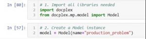 Por su lado, Python requiere un editor de texto de preferencia del usuario (para el caso de este ejemplo, utilizaremos Jupyter Notebook) e importar la librería docplex con el módulo necesario para resolver el problema. En este caso utilizaremos el módulo de Mathematical programming: mp. Adicionalmente, debemos definir una instancia Model donde almacenaremos los elementos que necesitamos para definir el modelo.