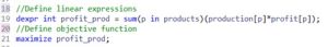 La definición de expresiones no sería indispensable para este caso ya que la función objetiva es muy sencilla. Esta práctica puede ser mejor utilizada cuando trabajamos con funciones objetivas con muchos componentes y definiciones largas para tener orden en el código.